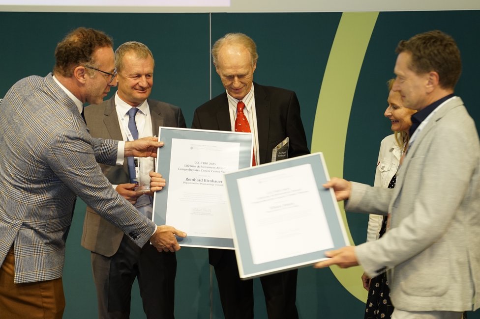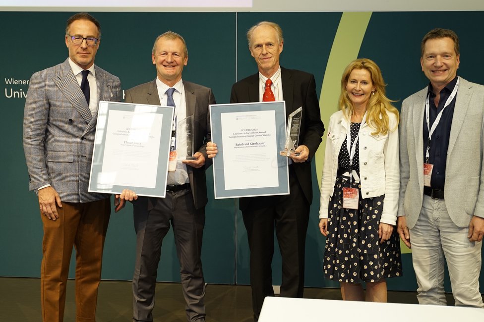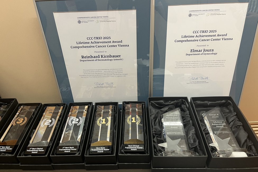 The Comprehensive Cancer Centre (CCC) Vienna of MedUni Vienna and University Hospital Vienna presented this year's CCC Lifetime Achievement Award to two outstanding personalities who have set global standards in cancer prevention: Reinhard Kirnbauer and Elmar Joura are honoured for their fundamental and clinical contributions to the development and global implementation of HPV vaccination. The awards were presented at the CCC TRIO - Translational Research In Oncology symposium on 13 June 2025.