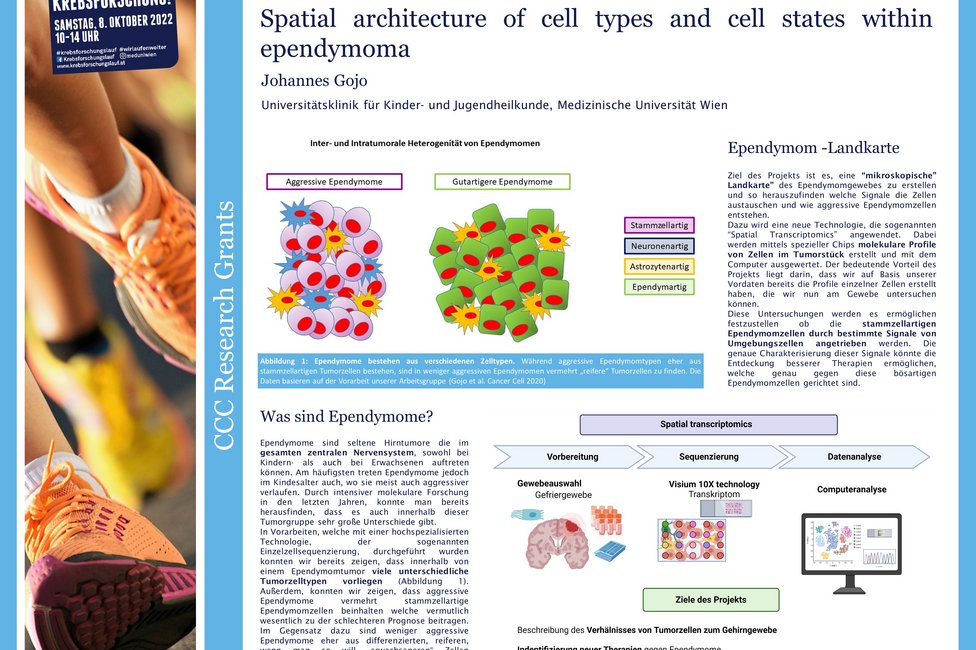 Ependymome sind spezielle, häufig aggressive Hirntumoren. Seit fast einem Jahrzent forschen Johannes Gojo, Universitätsklinik für Kinder- und Jugendheilkunde von MedUni Wien und AKH Wien sowie Leiter des Young CCC, und sein Team an dieser Erkrankung und konnten klären, warum manche dieser Tumoren besonders aggressiv und schlecht zu behandeln sind. Im vom Comprehensive Cancer Center mit einen Forschungsgrant geförderten Projekt, gehen sie einen Schritt weiter und untersuchen, wo in der Tumorstruktur die speziell bösartigen Zellen zu finden sind und wie sie mit ihrem Umfeld, dem sogenannten Tumor Microenvironment interagieren. Damit könnten neue Behandlungsansätze gewonnen werden.