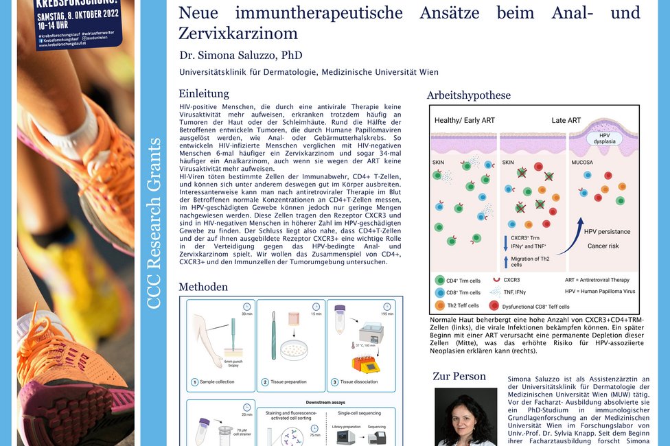 HIV-positive Menschen, die durch eine antivirale Therapie (ART) keine Virusaktivität mehr aufweisen, erkranken trotzdem häufig an Tumoren der Haut oder der Schleimhäute. Rund die Hälfte der Betroffenen entwickeln Tumoren, die durch Humane Papillomaviren ausgelöst werden, wie Anal- oder Gebärmutterhalskrebs. Simona Saluzzo, Universitätsklinik für Dermatologie und Mitglied des Comprehensive Cancer Center (CCC) von MedUni Wien und AKH Wien, erforscht in ihrer vom CCC geförderten Arbeit die Mechanismen, die dahinterstehen. Ihr Ziel ist es, neue immuntherapeutische Ansätze gegen das Analkarzinom und den Gebärmutterhalskrebs (Zervixkarzinom) zu entwickeln.