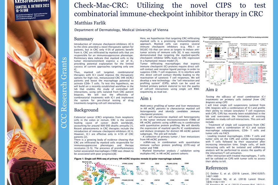 Matthias Farlik-Födinger beschäftigt sich intensiv mit einer speziellen Untergruppe des Dickdarmkrebses, dem sogenannten mikrosatellitenstabilen (MSS) Kolonkarzinom, das sich dadurch auszeichnet, dass nur wenige Gene mutiert sind. Sein Interesse gilt der Mikroumgebung des Tumors und somit den Zellen, die dort interagieren.