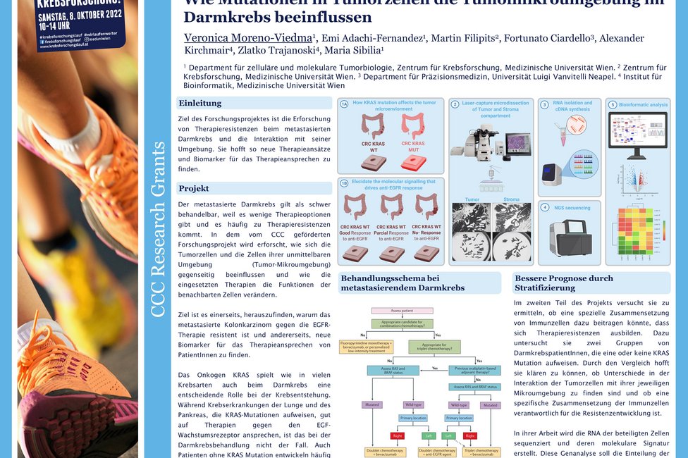 Der metastasierte Darmkrebs gilt als schwer behandelbar, weil es wenige Therapieoptionen gibt und es häufig zu Therapieresistenzen kommt. Veronica Moreno-Viedma, Zentrum für Krebsforschung der MedUni und Mitglied des Comprehensive Cancer Center (CCC) Vienna von MedUni Wien und AKH Wien, erforscht im vom CCC geförderten Forschungsprojekt, wie sich die Tumorzellen und die Zellen ihrer unmittelbaren Umgebung (Tumor-Mikroumgebung) gegenseitig beeinflussen und wie die eingesetzten Therapien die Funktionen der benachbarten Zellen verändern. Ziel ist es einerseits, herauszufinden, warum das metastasierte Kolonkarzinom gegen die EGFR-Therapie resistent ist und andererseits, neue Biomarker für das Therapieansprechen von PatientInnen zu finden.