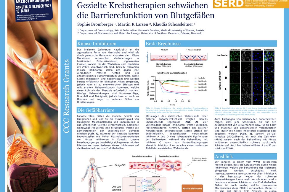Zielgerichtete Therapien zeigen in der Bekämpfung des malignen Melanoms, also des schwarzen Hautkrebses, große Wirkung. Leider führen vor allem Kinase-Inhibitoren, das sind Arzneistoffe, die das Tumorwachstum hemmen, häufig zu schweren Nebenwirkungen, hervorgerufen durch Schädigungen der Gefäße. Sophie Bromberger untersucht in ihrem Forschungsprojekt, das durch die CCC-Forschungsförderung unterstützt wird, welche zellulären Mechanismen diese unerwünschten Folgeerscheinungen auslösen. Ziel ist es, Erkenntnisse darüber zu gewinnen, wie man Nebenwirkungen eindämmen und Medikamente exakter dosieren kann, damit sie besser verträglich sind. Das könnte dazu führen, dass PatientInnen neue und verbesserte Therapieoptionen zur Verfügung stehen.