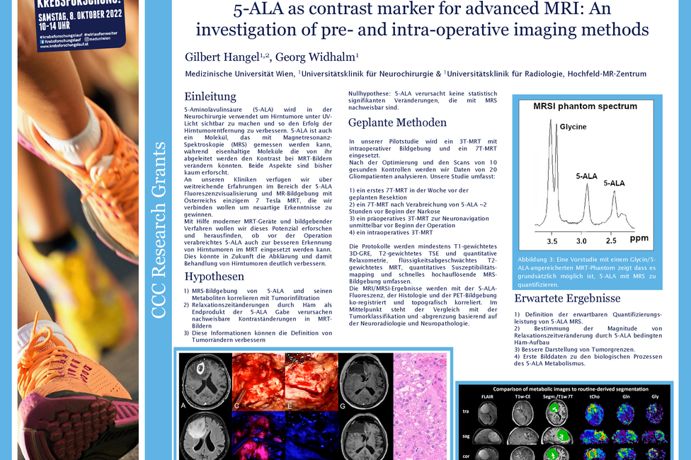 Das Team rund um Hangel verfolgt im vom Comprehensive Cancer Center (CCC) geförderten Krebsforschungsprojekt zwei wissenschaftliche Fragestellungen. In der ersten wird mittels 7 Tesla MRT geprüft, ob der Einsatz von 5-ALA in der MRT-Untersuchung vor der Operation zu Änderungen bei der Darstellung des Tumors führt. Im besten Fall könnte der Tumor noch besser abgegrenzt werden, was eine wichtige Hilfestellung bei der OP-Planung und Kontrolle nach der OP sein könnte. Das wäre wichtig, da verbleibende Tumorzellen oft zum Nachwachsen des Tumors führen können.