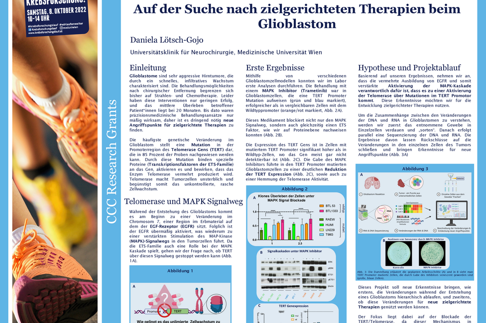 Glioblastome sind sehr aggressive Hirntumoren. In 85 Prozent der Glioblastomproben kann eine Mutation in der Promoterregion des Telomerase Gens (TERT) nachgewiesen werden. Durch diese Mutation binden spezielle Proteine (Transkriptionsfaktoren der ETS-Familie) an das Gen, aktivieren es und bewirken, dass das Enzym Telomerase vermehrt produziert wird. Telomerase macht Tumorzellen quasi unsterblich. Daniela Lötsch, Universitätsklinik für Neurochirurgie von MedUni Wien und AKH Wien sowie Mitglied des Comprehensive Cancer Center (CCC) der beiden Einrichtungen, untersucht im vom CCC geförderten Projekt, ob und wie diese TERT Promoter Mutation mit der sogenannten MAP-Kinase-Kaskade, einem Signalweg, der das Wachstum der Tumorzellen begünstigt, zusammenhängt. Sie sequenziert dafür das Genom der Tumorzellen und hofft damit, neue molekularbiologische Angriffspunkte für zielgerichtete Therapien zu finden.